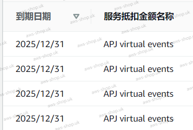 - 下图的4个 到期日期为 2025/12/31,服务抵扣金额名称为 APJ virtual events 的代金券是同一个批次的代金券。