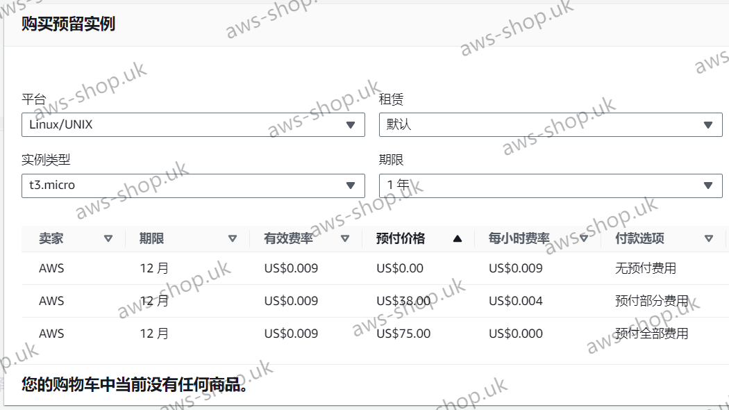 上图是一个购买t3.micro预留实例的例子,可以看见有两种付款选项:无预付费用、预付部分费用、预付全部费用。